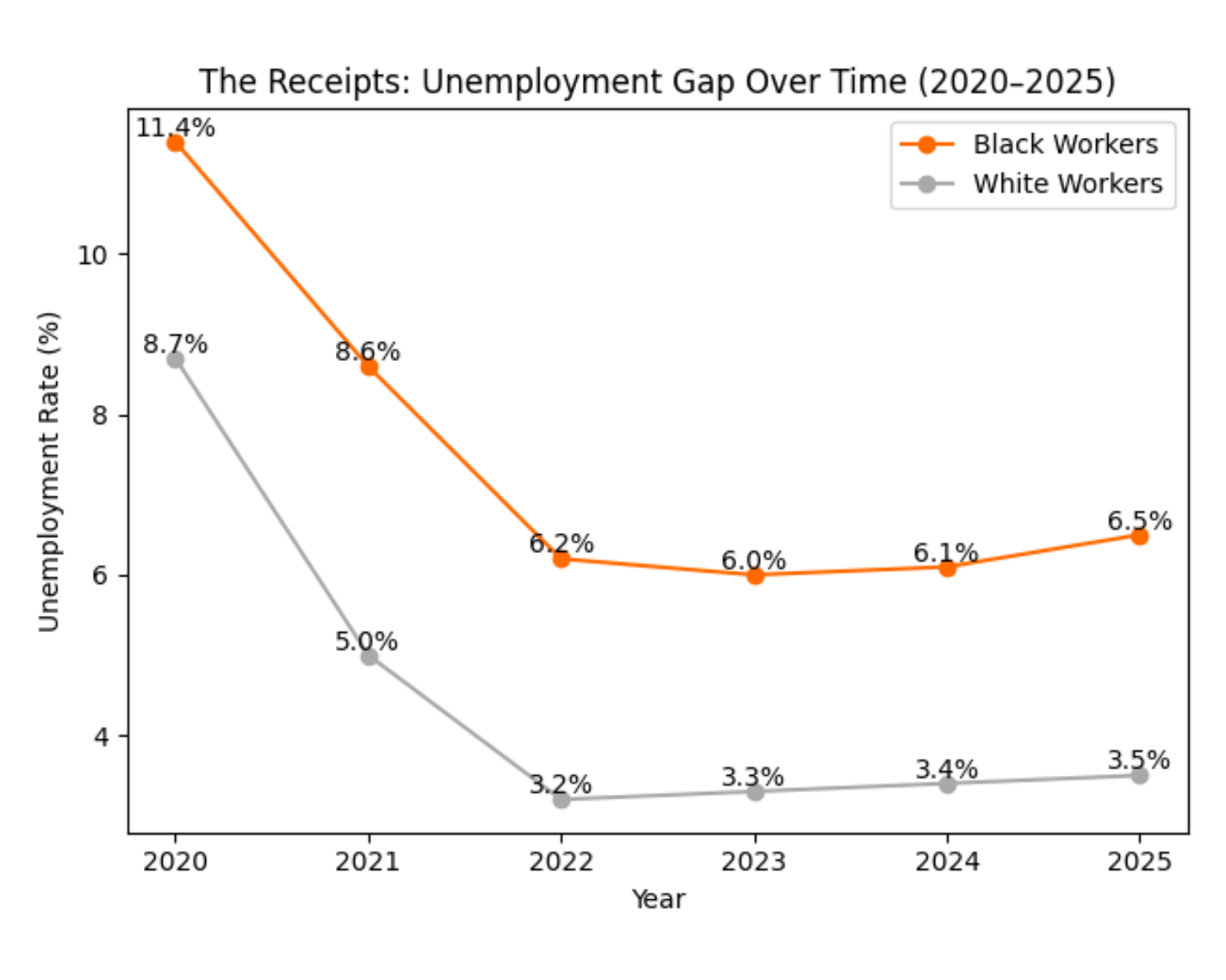 The data reflects a consistent pattern: Black workers experience higher unemployment rates over time, with the gap remaining even as overall labor market conditions change.